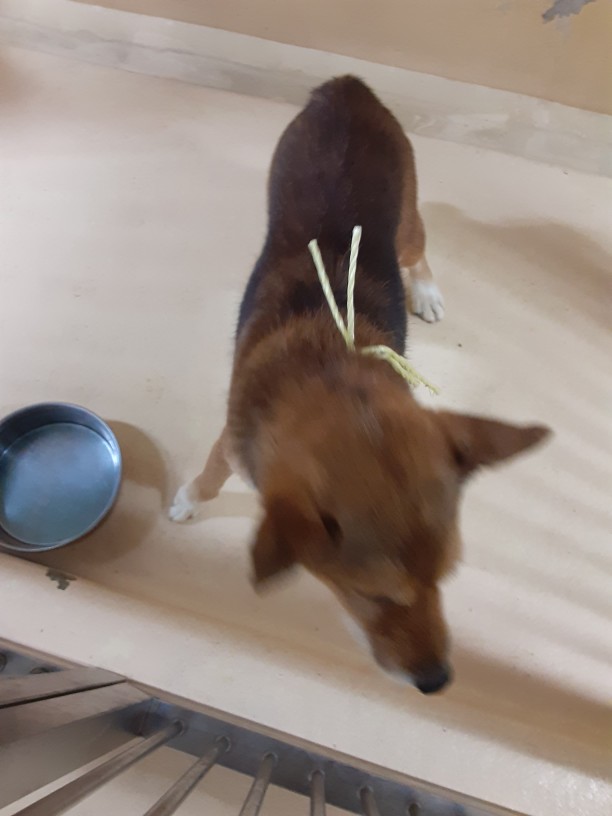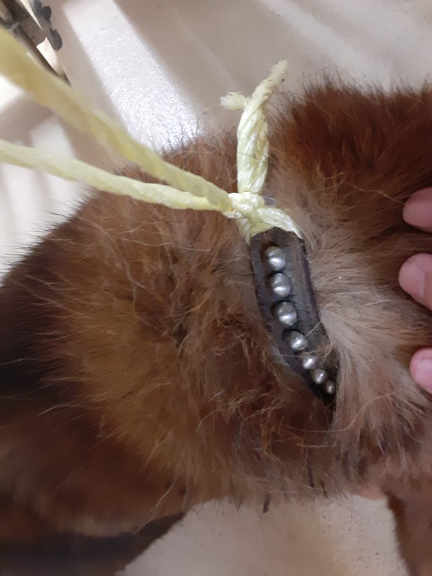 首輪はもともと青色だったものが劣化でほぼ茶色になっている。首輪に黄色いビニールひも付き。