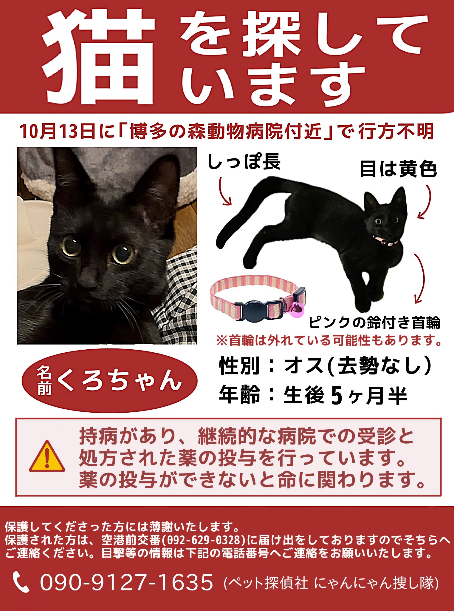 もし保護してくださっている方がいらっしゃいましたら、定期的な通院が必要ですので、早急にご連絡いただけますと幸いです。