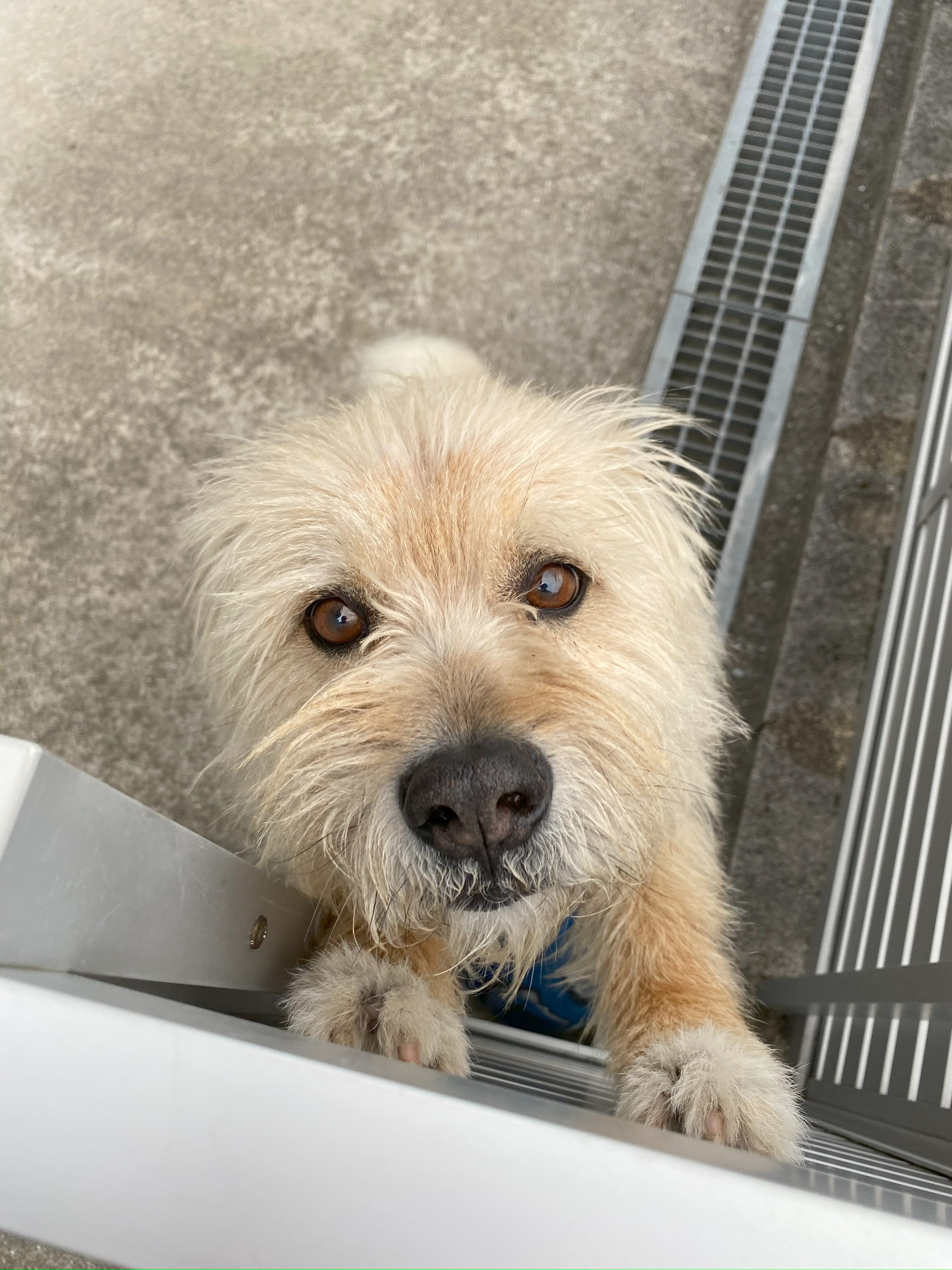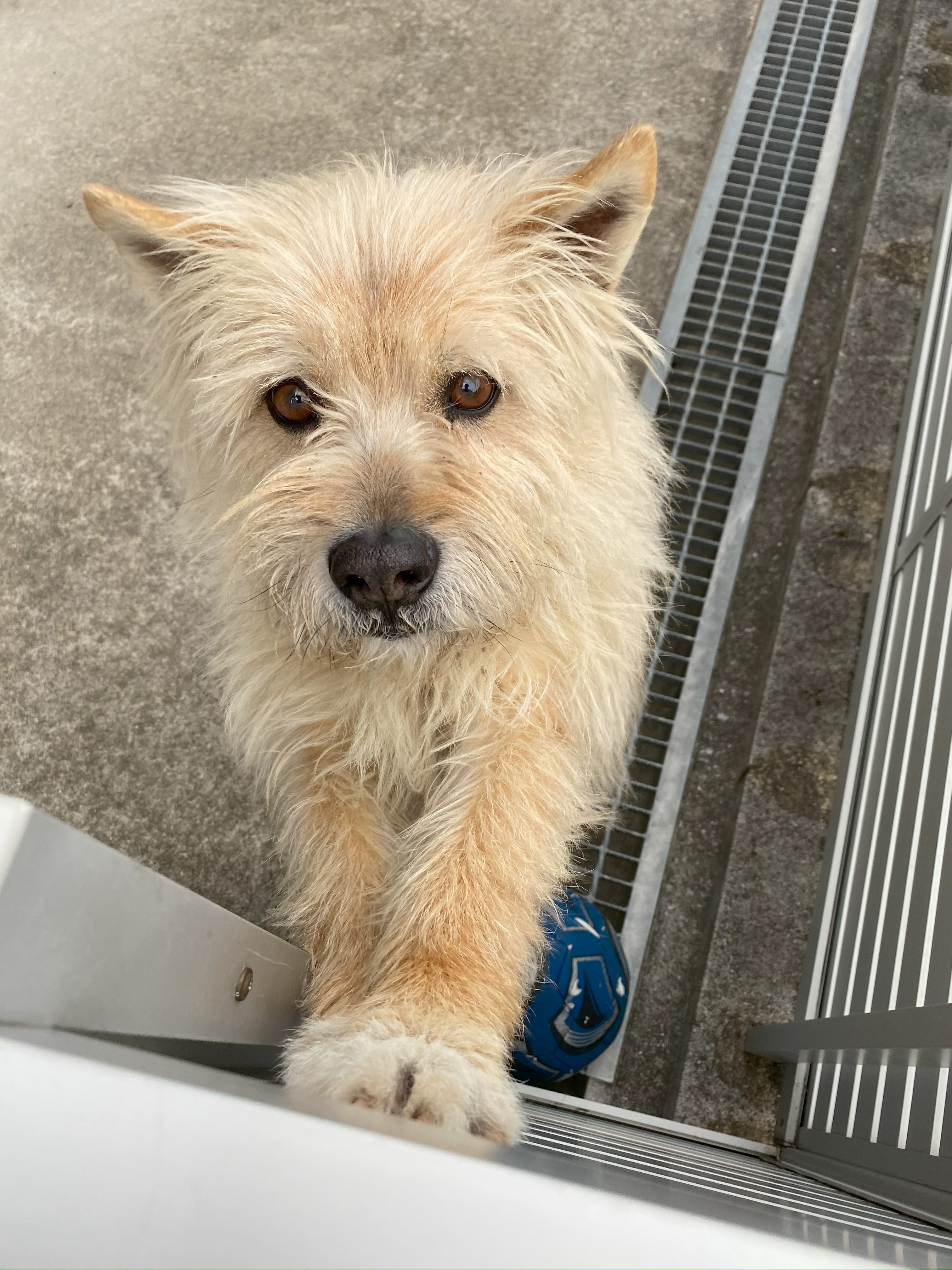 ・テリア犬が混ざったようなベージュ色の長くてまっすぐな硬い毛が特徴の犬です。瞳は茶色です。