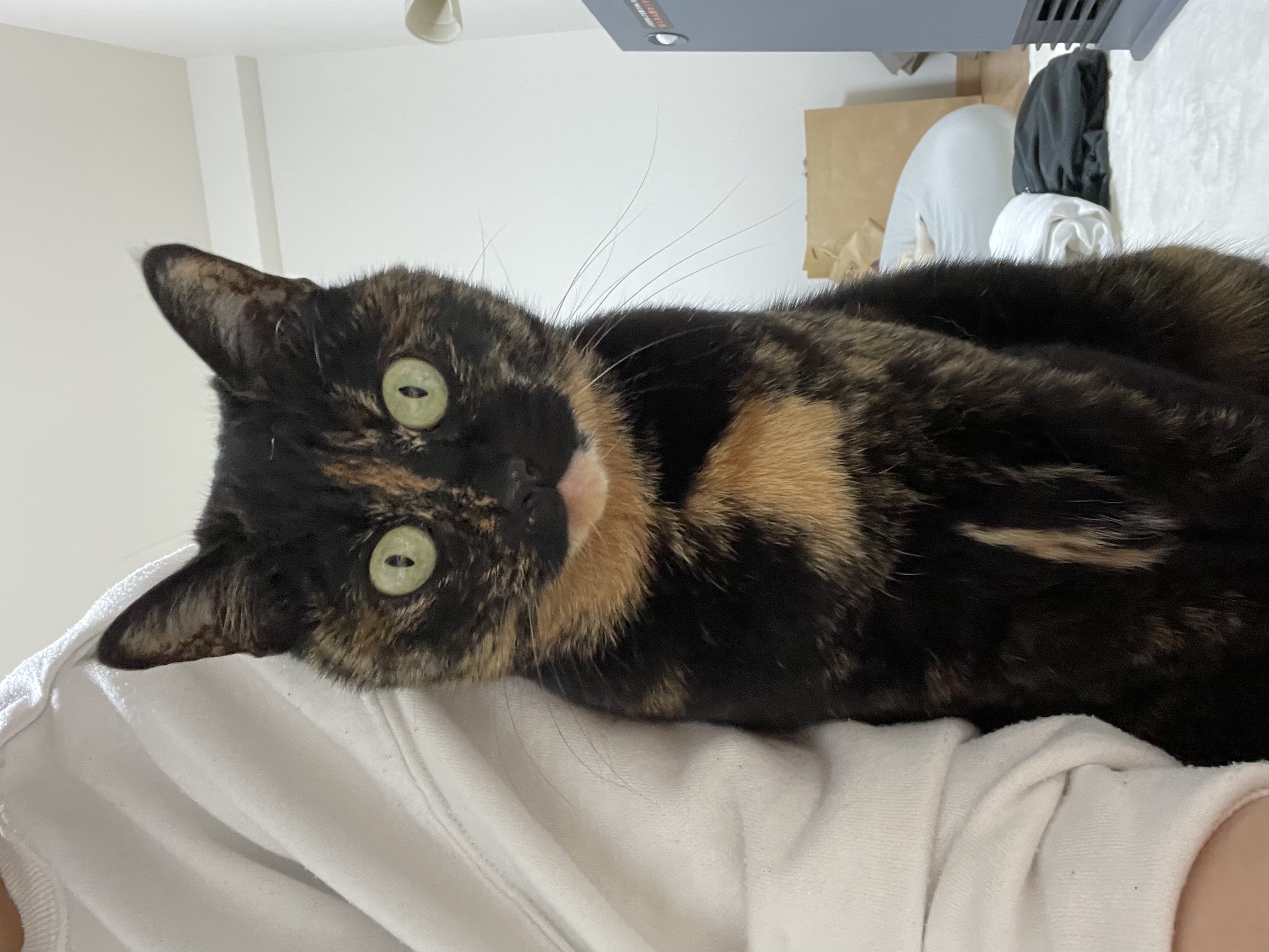 全体の毛色は黒に茶混じりで、顎から胸あたりにかけて白い毛。家族以外には警戒心が強いです。 「ミミ」と名前を呼ぶと鳴きます。