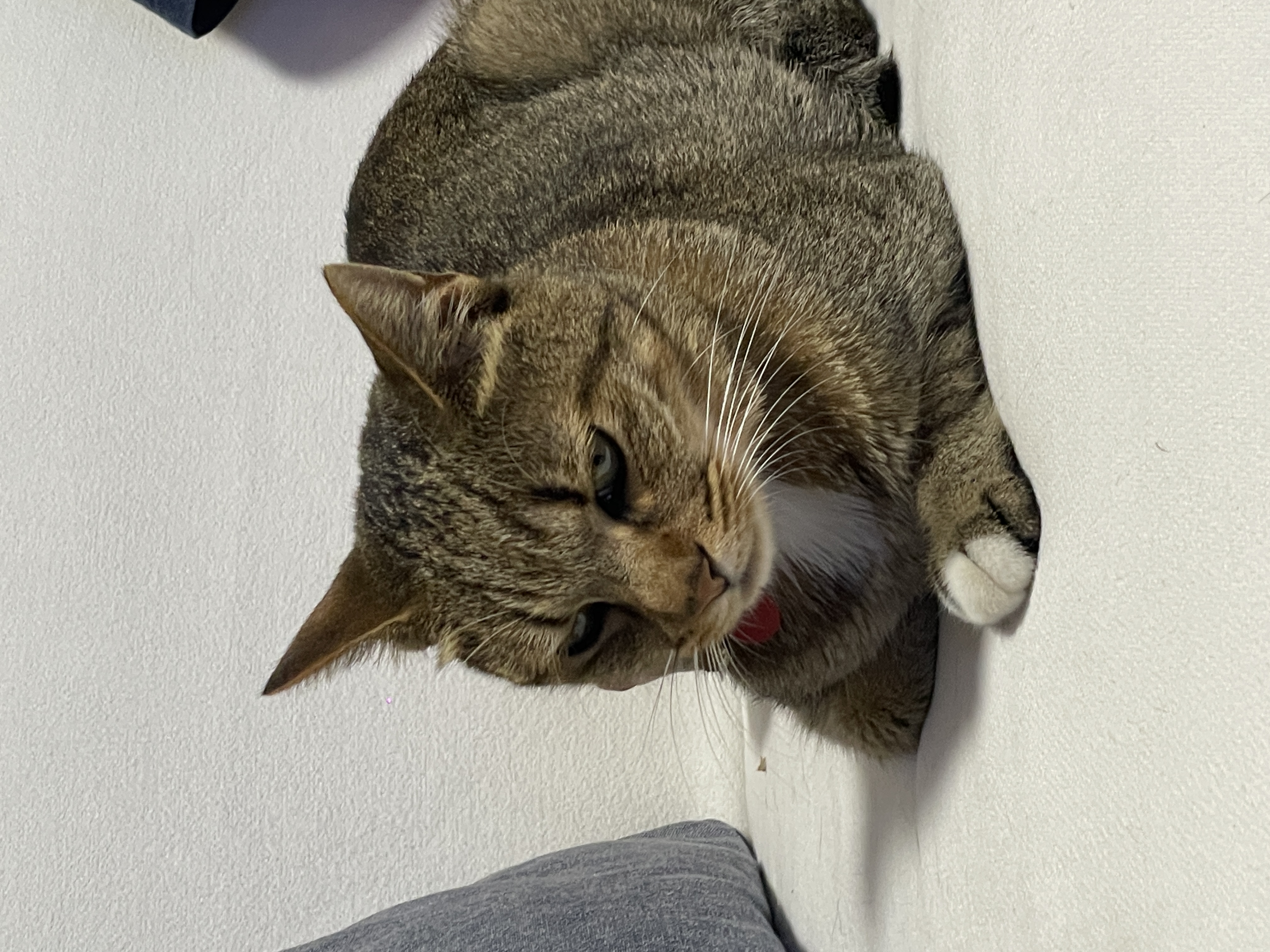 ネームタグには飼主の電話番号が書いてあります。後ろ足は白い靴下をはいたようなキジトラです。お腹も少し白い部分があります。