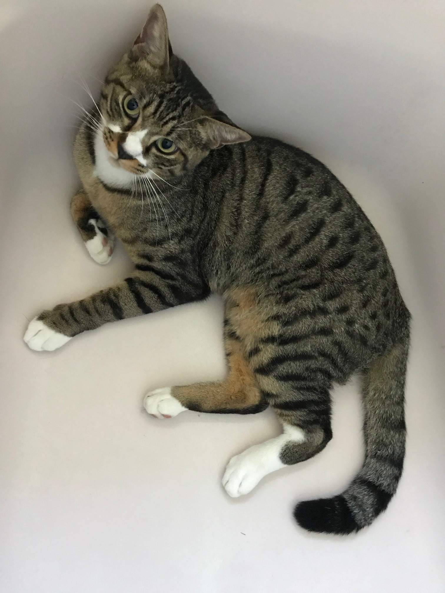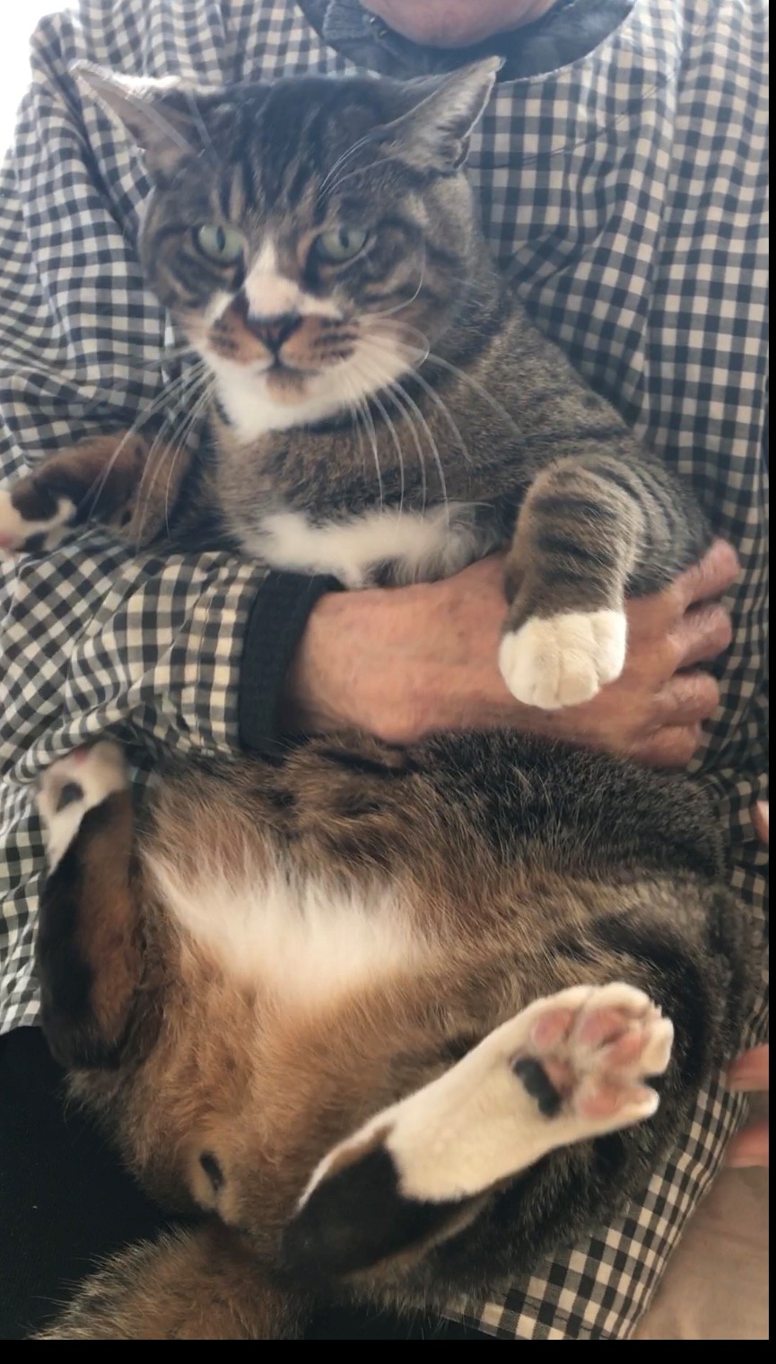 | 毛色 | キジ柄(茶色とグレーが混じったような色に黒の縞々)に鼻・顎下・手足先・お腹の一部が白 |